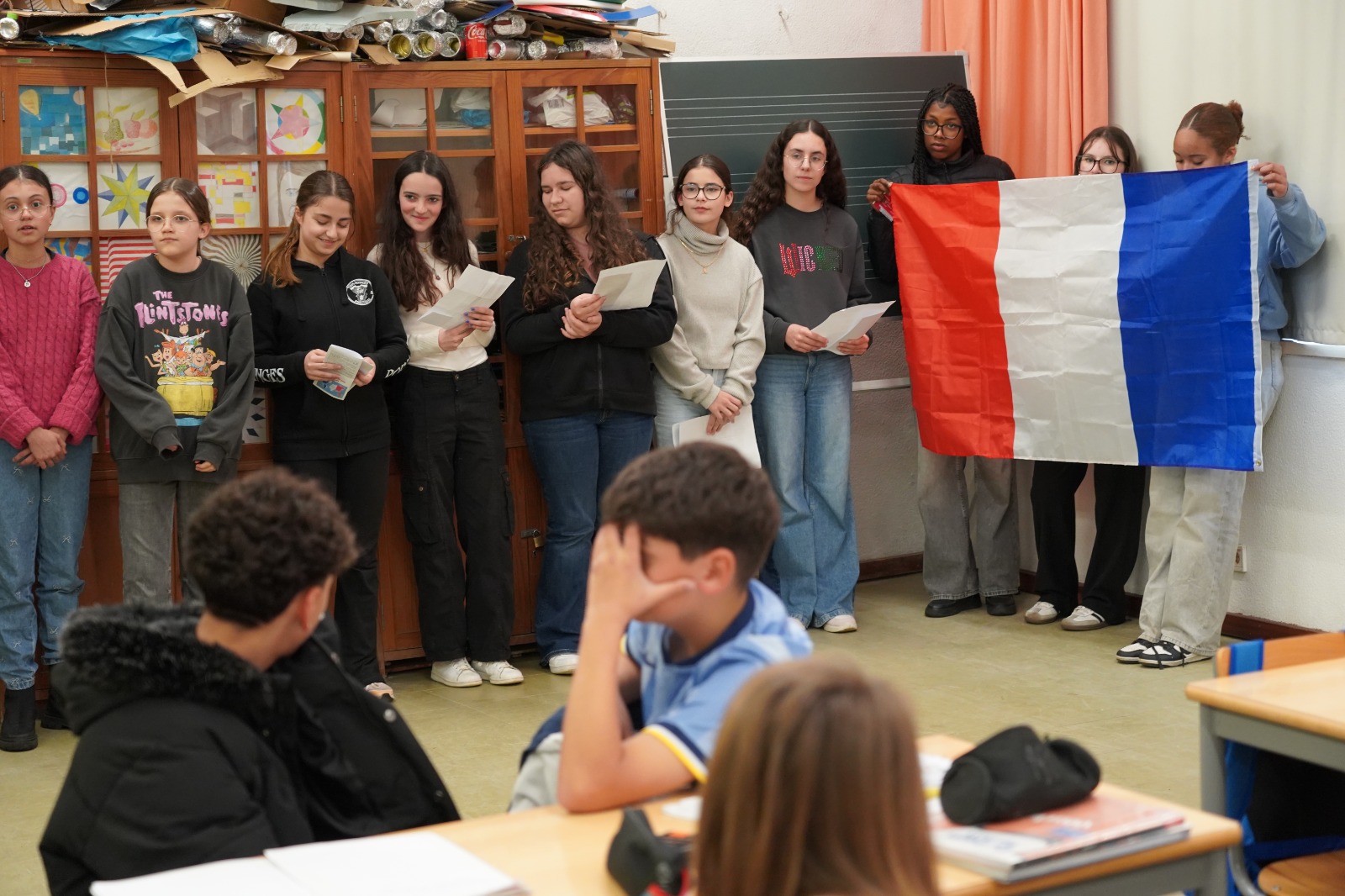 Nesta atividade participaram os alunos das turmas que têm francês e os do Clube de Música, com distribuição e leitura de panfletos informativos e interpretação do Hino Francês “La Marseillaise”.