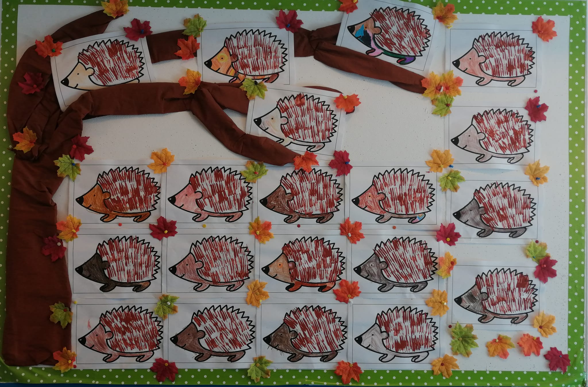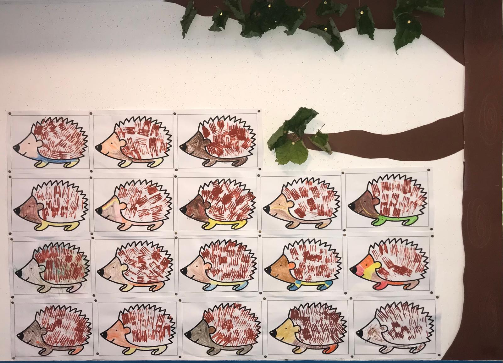 Com a chegada do outono, os petizes da sala verde realizaram uma pintura/carimbagem com um garfo, preenchendo toda a parte dos espinhos do ouriço…Depois juntámos os trabalhos para compor o…